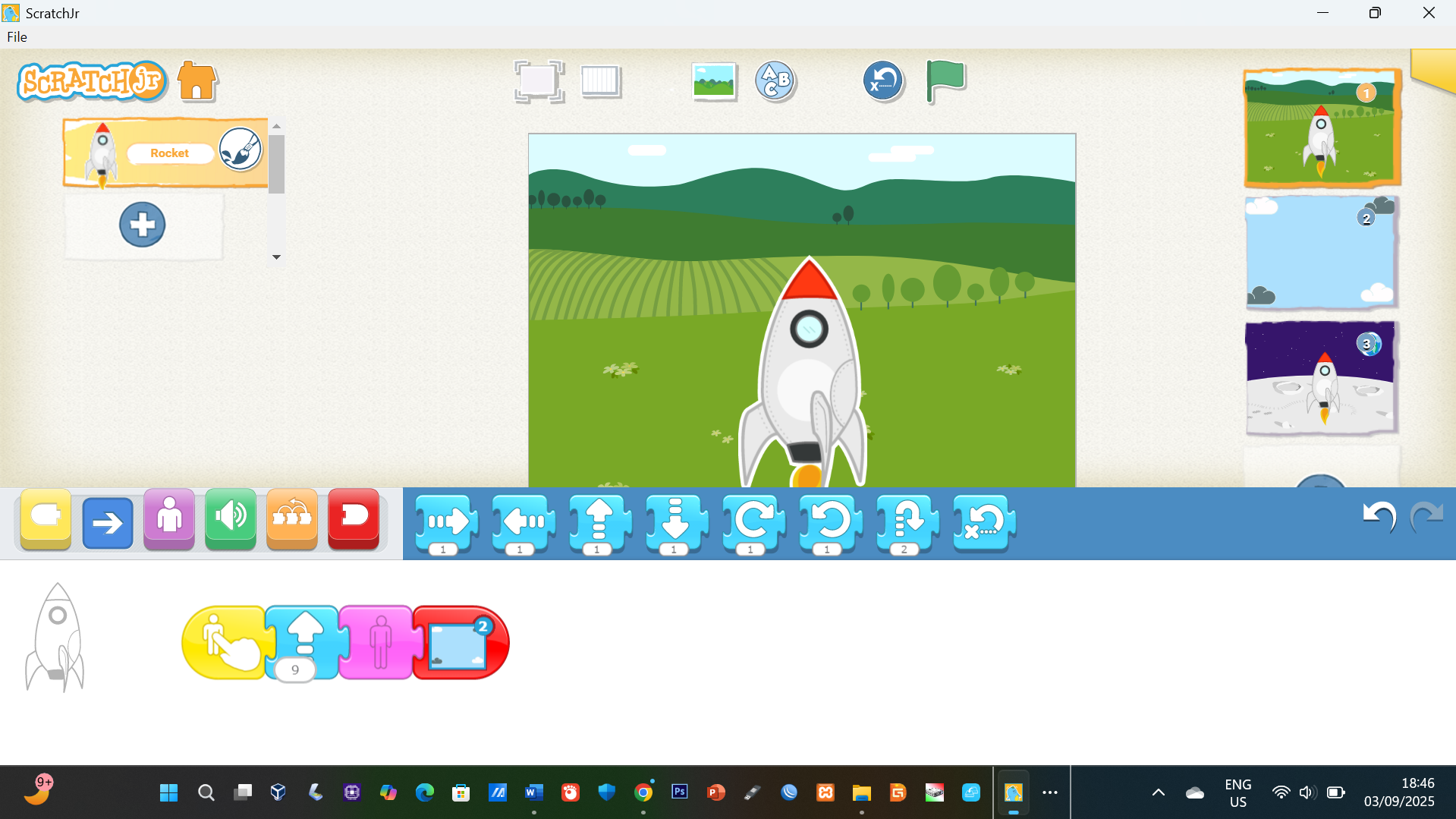 Melatih berfikir komputasional dengan menggunakan metode belajar blok kode yang berurutan untuk menentukan arah belajar menyusun tantangan dari layout scartch.jr